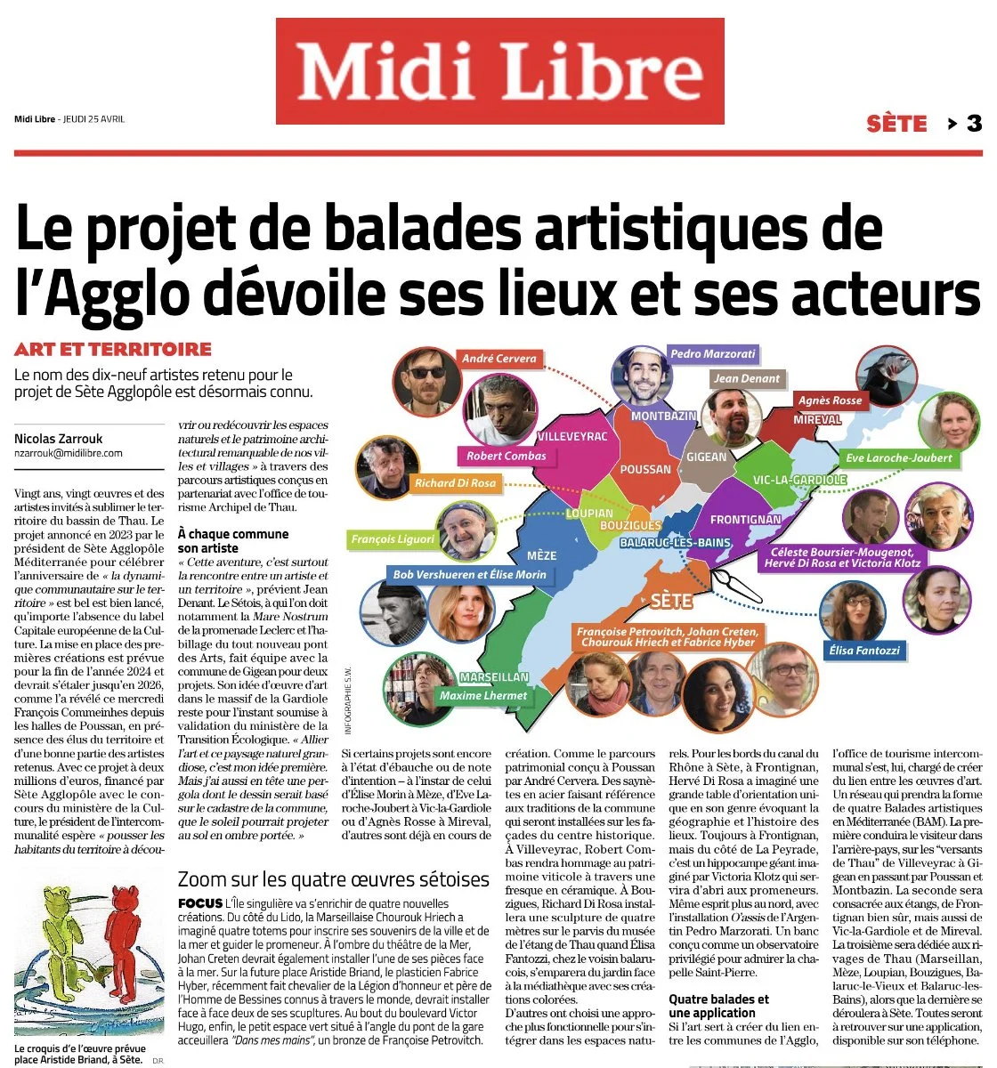Si certains projets sont encore à l’état d’ébauche ou de note d’intention – à l’instar de celui d’Élise Morin à Mèze, d’Ève Laroche-Joubert à Vic-la-Gardiole ou d’Agnès Rosse à Mireval, d’autres sont déjà en cours de création. Comme le parcours patrimonial conçu à Poussan par André Cervera. Des saynètes en acier faisant référence aux traditions de la commune qui seront installées sur les façades du centre historique. À Villeveyrac, Robert Combas rendra hommage au patrimoine viticole à travers une fresque en céramique. À Bouzigues, Richard Di Rosa installera une sculpture de quatre mètres sur le parvis du musée de l’étang de Thau quand Élisa Fantozzi, chez le voisin balarucois, s’emparera du jardin face à la médiathèque avec ses créations colorées.