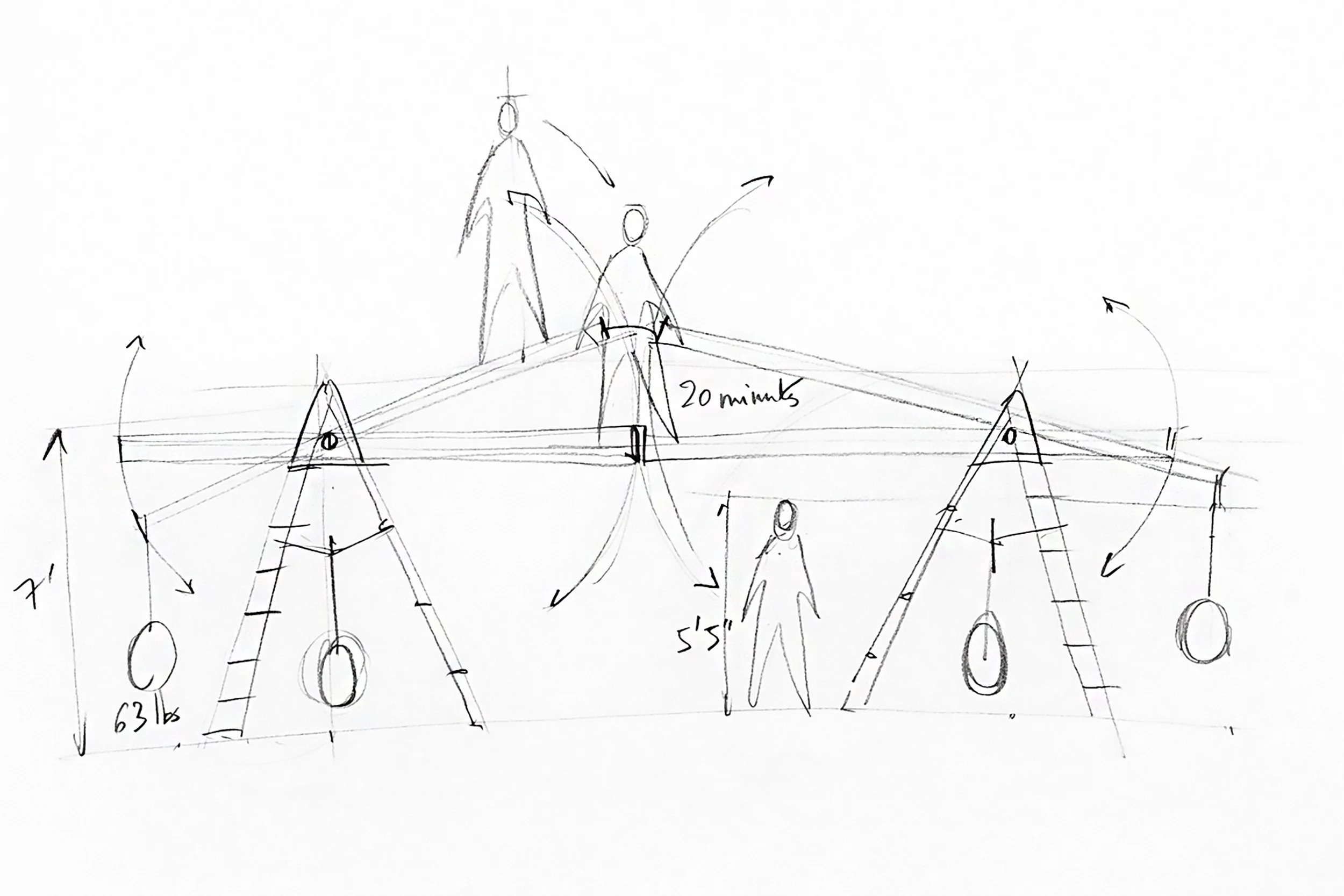Vêtue d’une robe de soirée, l’artiste assemble en public une structure cinétique monumentale composée de poutres et d’échelles, formant un dispositif de balanciers atteignant près de vingt pieds de large et s’élevant à plus de deux mètres du sol. Une fois la structure achevée, le sens de l’œuvre émerge au moment précis où le corps s’y engage : marcher, se tenir, traverser, trouver un équilibre provisoire. Ni calculées mathématiquement ni sécurisées par des systèmes cachés, les répartitions de poids et de contrepoids sont évaluées intuitivement, à partir de maquettes manipulées en amont — une intelligence du geste que les neurosciences décrivent comme une forme de cognition plus rapide que la conscience.