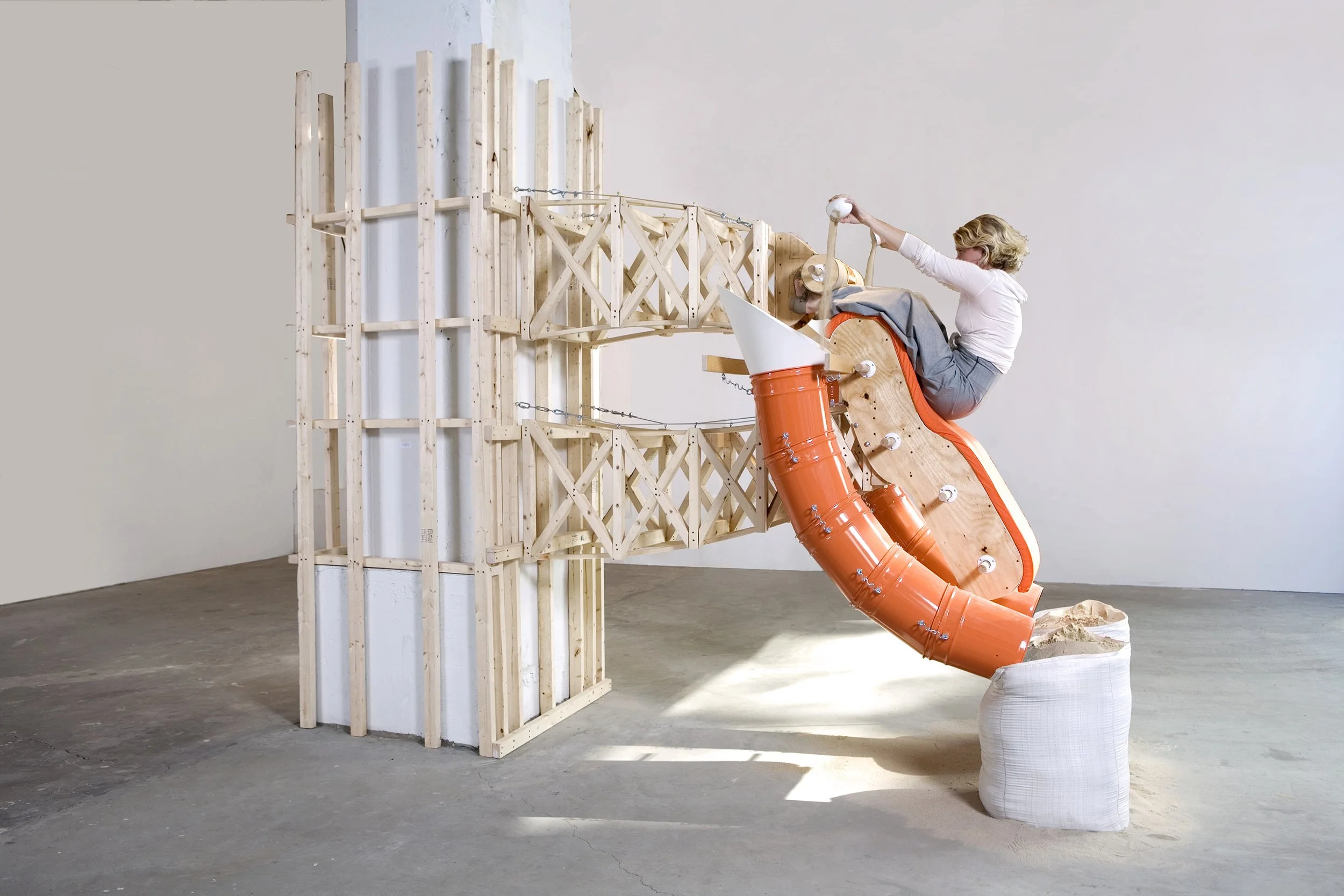 Here, the body appears less as an expressive subject than as a knowing body, operating in an automatic mode, stripped of narrative intention, according to an economy of gesture akin to training, repetition, and endurance. The tension between control and release, calculated balance, is rendered with precision: the architectural device, the counterweight system, and the color orange—a functional signal—compose a visual language in which the body of the artist becomes the temporary activator of a sculpture already charged with movement. Drunken Body Up & Down thus extend the performance into the realm of the image, not to freeze the action, but to convey its inner mechanics: a gesture without resolution, poised between humor and cruelty, in which the contemporary body is shaped, constrained, and endlessly repeated.