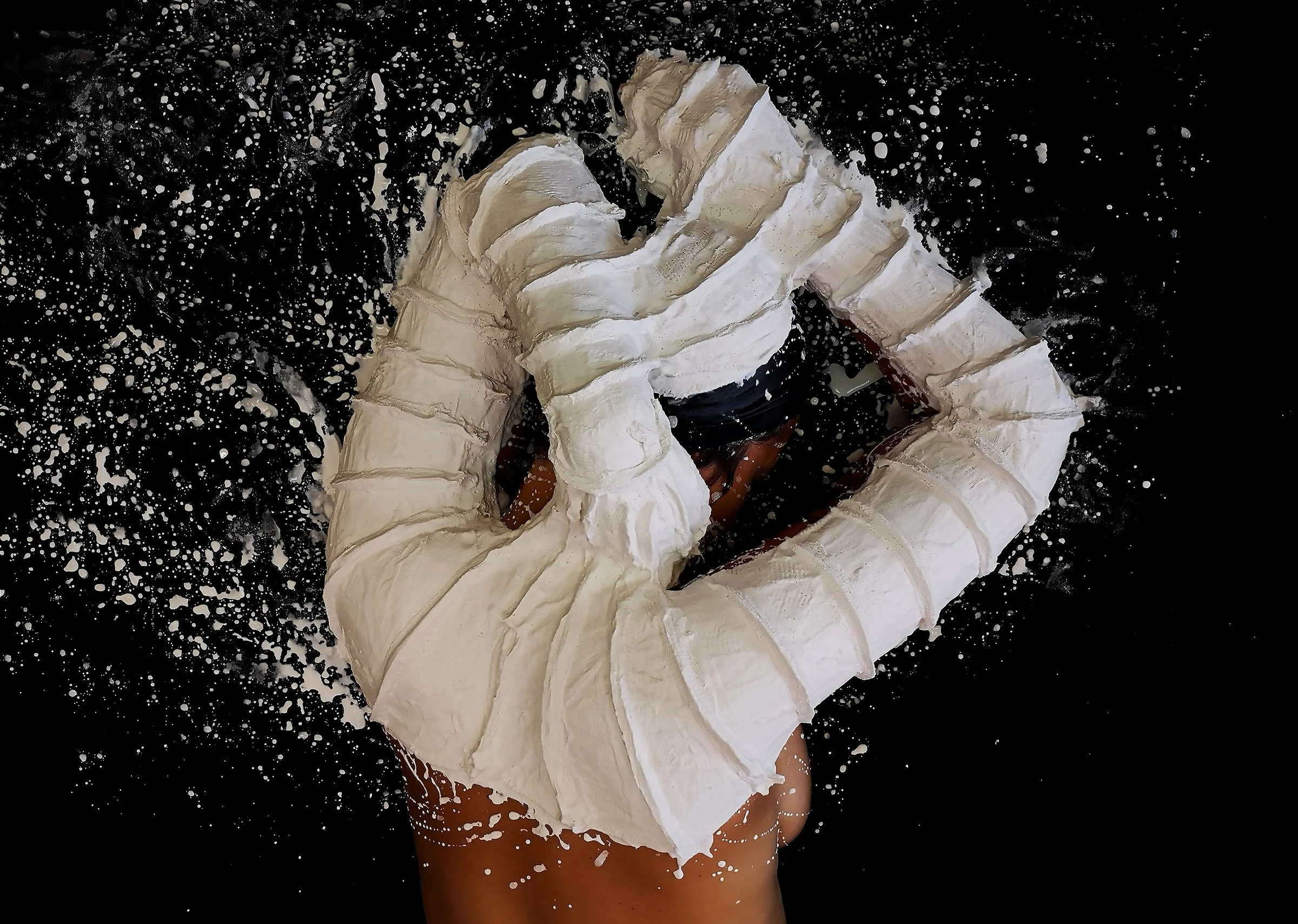 This photographic series emerges from a fundamental investigation into body casting, conceived as the gradual construction of a formal archive that lies at the origin of the entire sculptural work developed in the Body-Scapes series. Produced in the studio, either individually or in pairs, these casts do not aim at perfect anatomical reproduction but at recording bodily shapes and states—support, surrender, embrace, suspension—captured in the urgency of the gesture. Photographed just before demolding, the plaster-covered body rests on a dark fabric that absorbs spatial references and transforms the scene into an almost cosmic field. Drips and splashes bear witness to the speed required by the process—essential to freeing the models from prolonged immobility—and inscribe the very energy of the action into the image. The reverse side of the cast, with its ridges, hollows, and reinforcing ribs (to rigidify the cast), becomes a sensitive topography in which the body appears to float, fragmented, at times sensual, at times more overtly carnal, without ever tipping into anecdote. From this experimental material emerge the foundational forms of the work—most notably the shoulder, revealed as a potential landscape—and the affirmation of a central principle: the process itself becomes image, and the image, in turn, becomes a site of projection for new sculptures, situated between body, memory, and imagination.