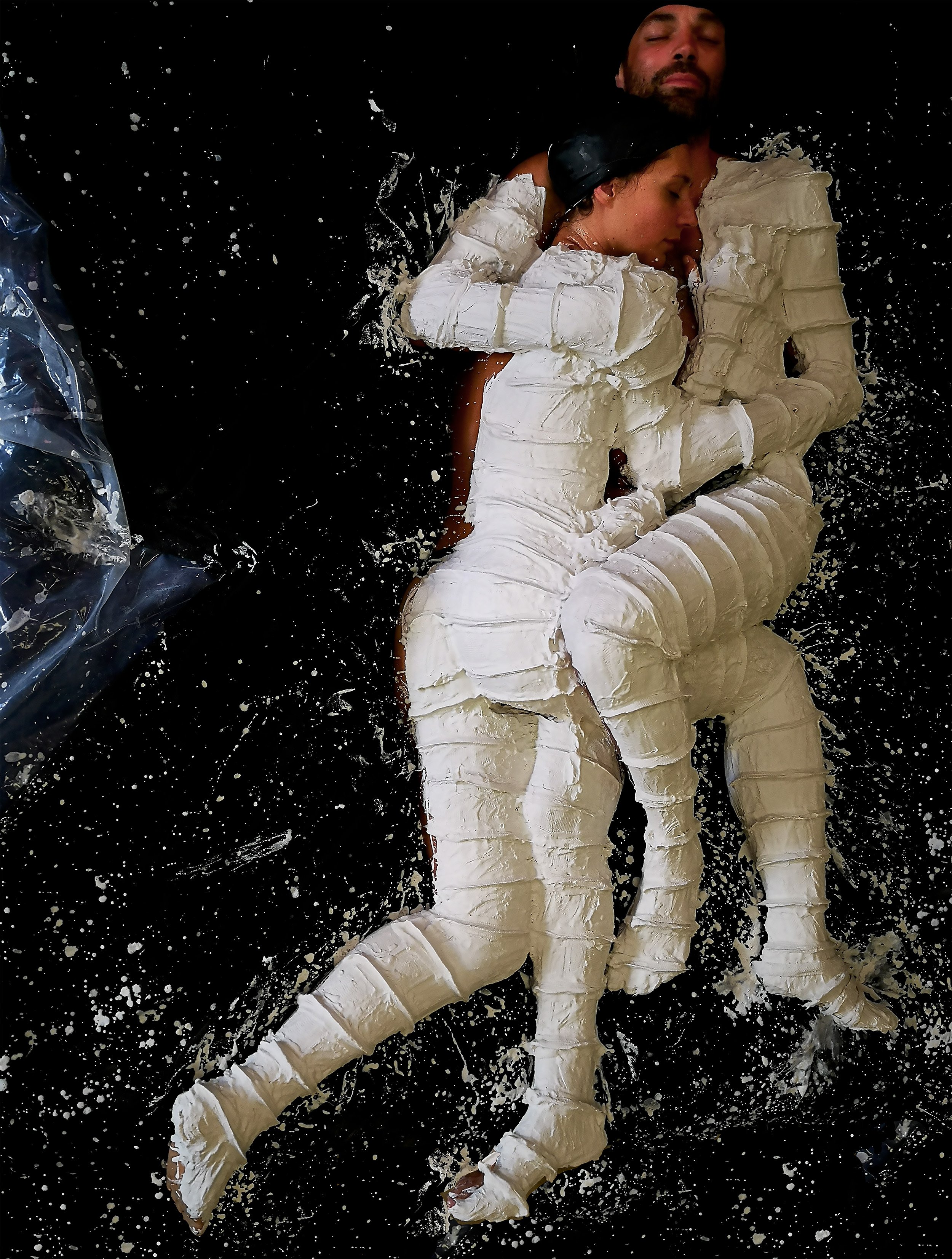 This photographic series emerges from a fundamental investigation into body casting, conceived as the gradual construction of a formal archive that lies at the origin of the entire sculptural work developed in the Body-Scapes series. Produced in the studio, either individually or in pairs, these casts do not aim at perfect anatomical reproduction but at recording bodily shapes and states—support, surrender, embrace, suspension—captured in the urgency of the gesture. Photographed just before demolding, the plaster-covered body rests on a dark fabric that absorbs spatial references and transforms the scene into an almost cosmic field. Drips and splashes bear witness to the speed required by the process—essential to freeing the models from prolonged immobility—and inscribe the very energy of the action into the image. The reverse side of the cast, with its ridges, hollows, and reinforcing ribs (to rigidify the cast), becomes a sensitive topography in which the body appears to float, fragmented, at times sensual, at times more overtly carnal, without ever tipping into anecdote. From this experimental material emerge the foundational forms of the work—most notably the shoulder, revealed as a potential landscape—and the affirmation of a central principle: the process itself becomes image, and the image, in turn, becomes a site of projection for new sculptures, situated between body, memory, and imagination.