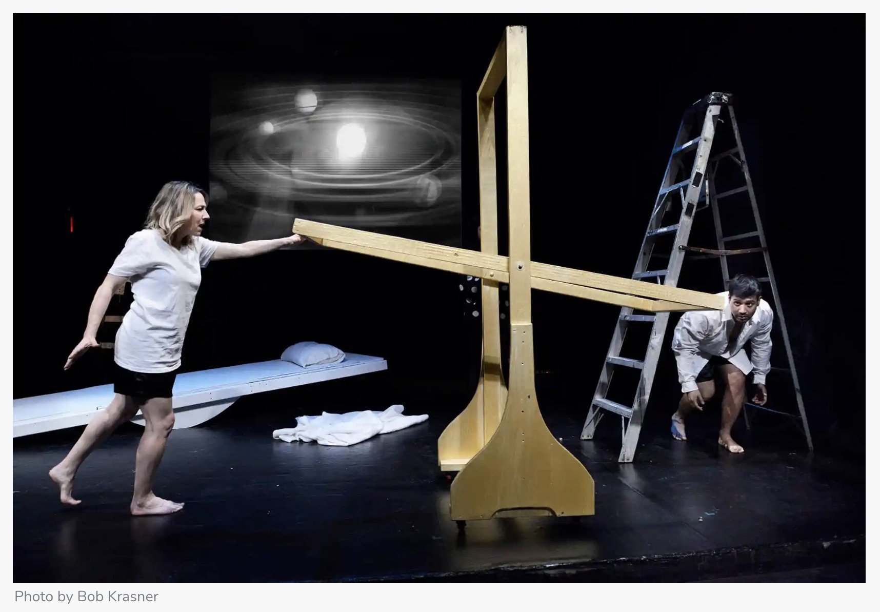 In the center of the black box theater is a large white seesaw adorned with a blanket and a pillow, created for its ability to lift the actors up and to provide some visual metaphors.